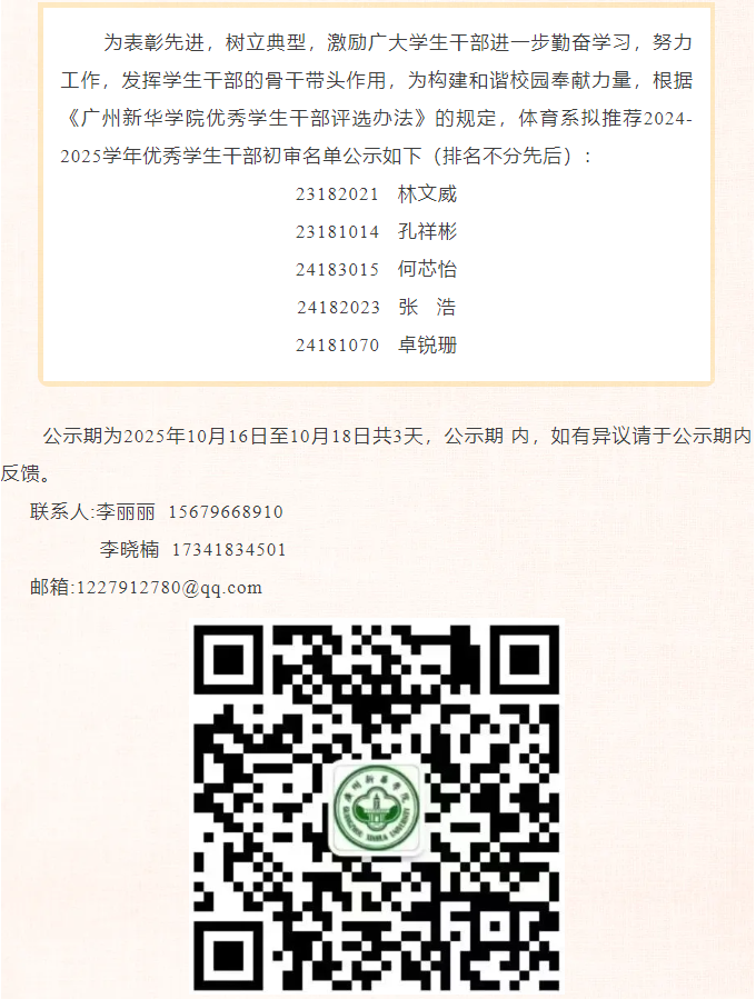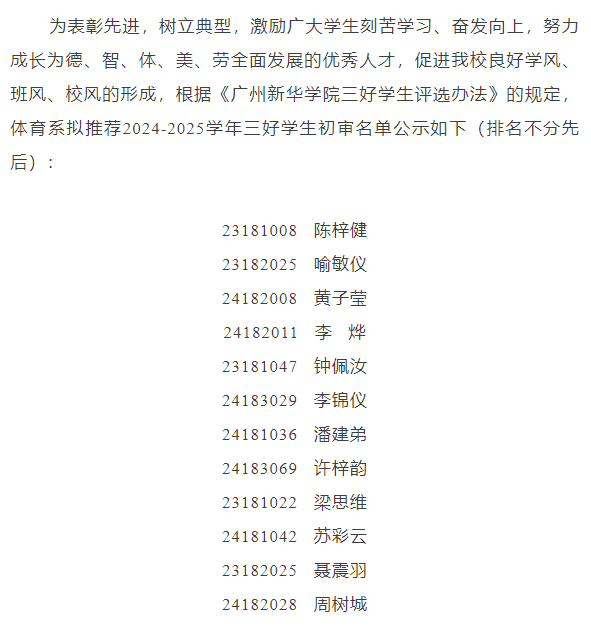 体育系2024-2025学年三好学生、优秀学生干部初审名单公示